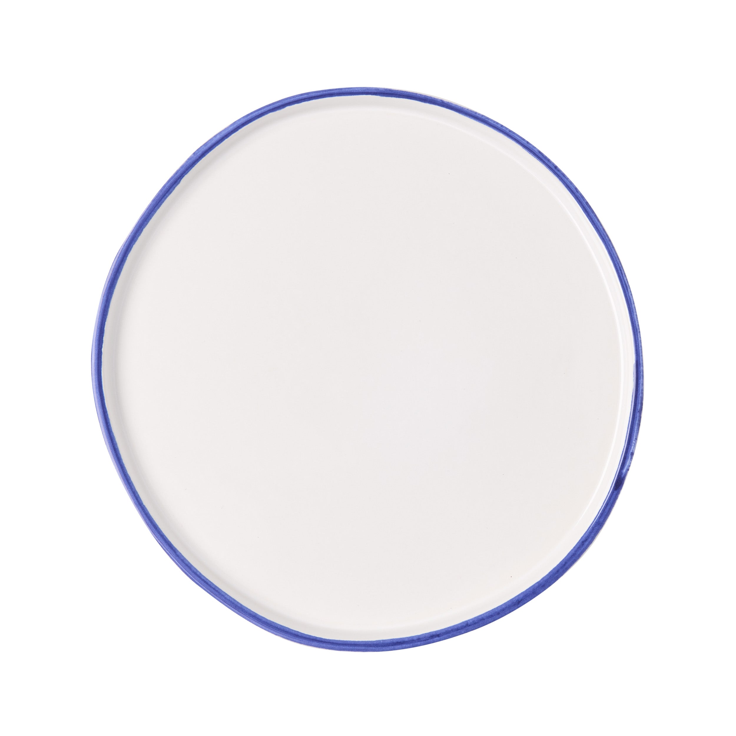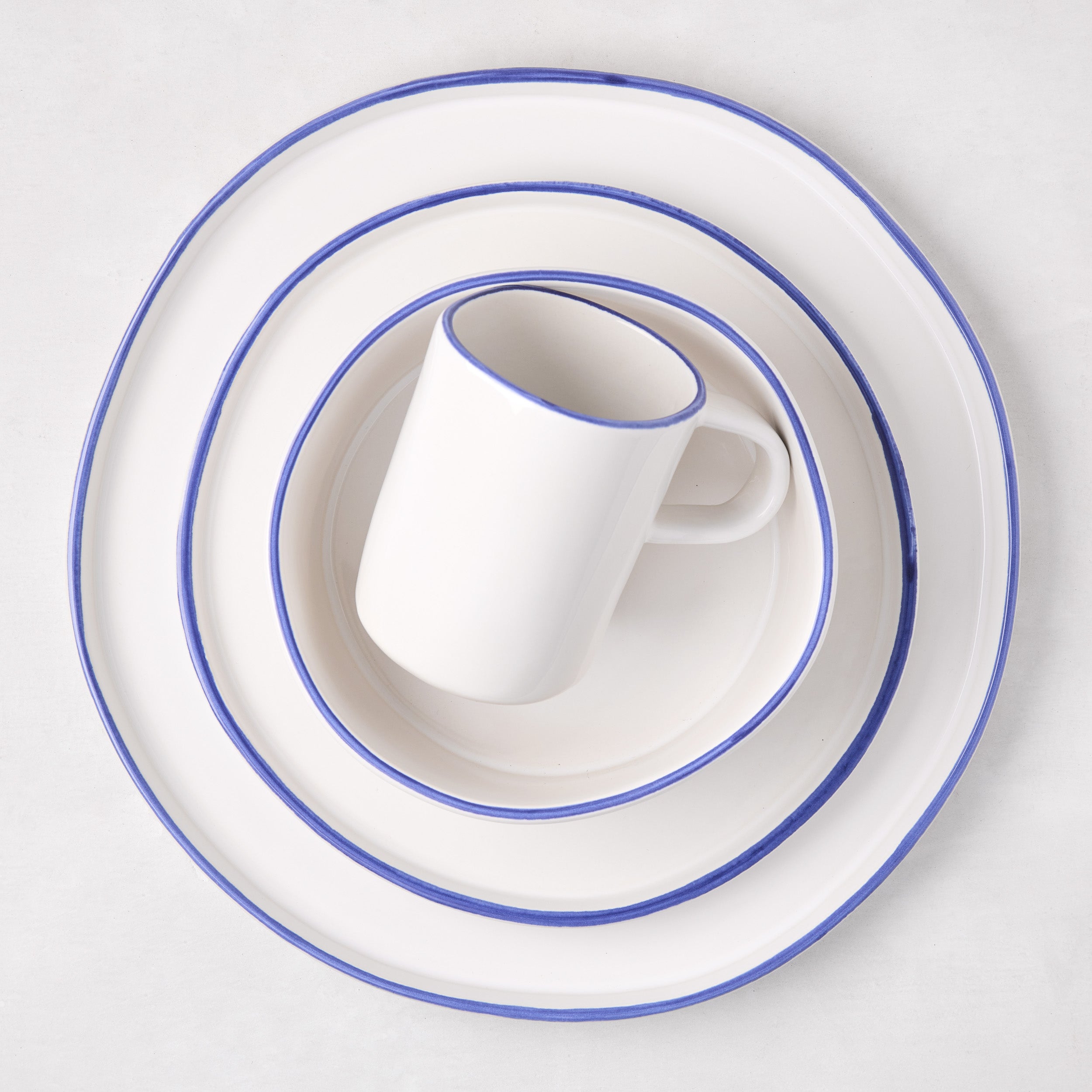 Rimmed in blue, our white-glazed Pacific Dinnerware Collection features perfectly imperfect artisanal edges. The Blue-Rimmed Stoneware Dinner Plate is the perfect foundation for your dinnerware set. Hand-finished and painted, the four-piece place setting presents meals with a laid-back yet elevated look. The fine stoneware dinner plate, salad plate, bowl, and mug go from warm oven to table, then cleaned up quickly in the dishwasher.